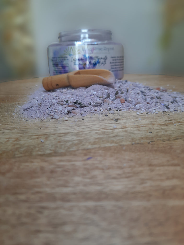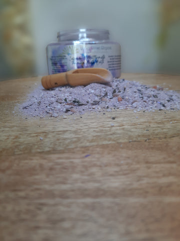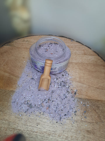 Ingredients: Epsom Salts (Magnesium Sulfate), Fine Sea Salt, Fine & Course Pink Himalayan Salt, Dendritic Salt, Hawaiian Black Salt, Sodium Lauryl Sulfoacetate, Rose Clay, Bentonite Clay, Baking Soda (Sodium Bicarbonate), Buttermilk Powder, Fragrance , Lavender Buds, Nettle Leaves , Mica and Polysorbate 80.