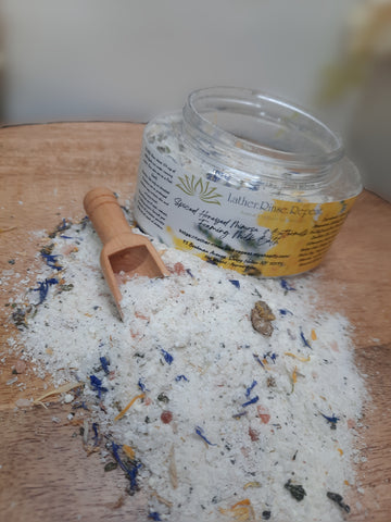 Ingredients: Epsom Salts (Magnesium Sulfate), Fine Sea Salt, Fine & Course Pink Himalayan Salt, Dendritic Salt, Hawaiian Black Salt, Sodium Lauryl Sulfoacetate, Kaolin Clay, Fragrance, Chamomile, Calendula, and Blue Cornflowers Botanicals, and Nettle Leaves