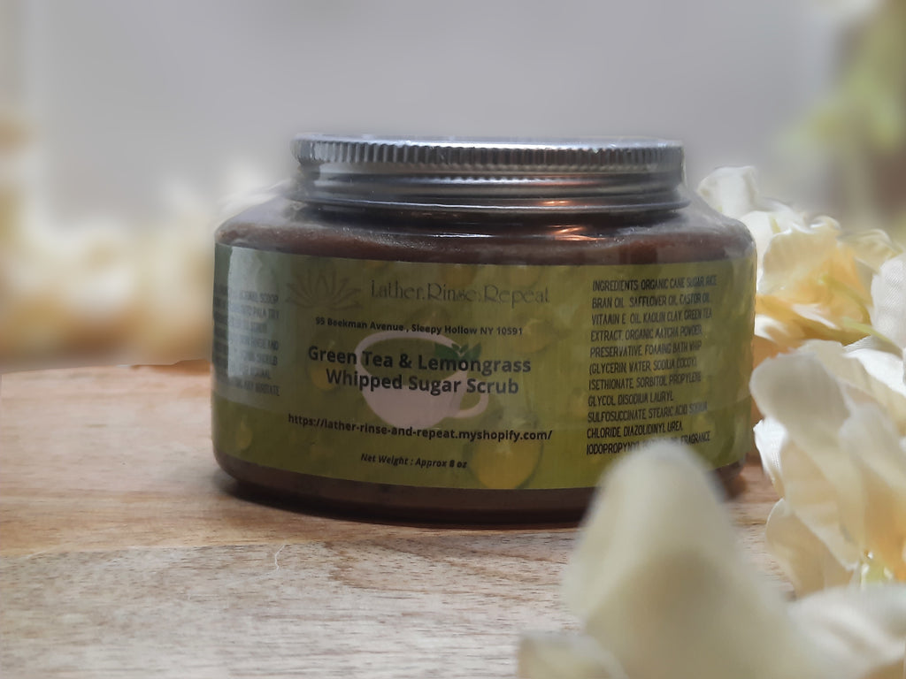 Ingredients: Organic Cane Sugar, Rice Bran Oil Safflower Oil, Castor Oil , Vitamin E Oil, Kaolin Clay, Green Tea Extract, Organic Matcha Powder Germail Preservative, Foaming Bath Whip (Glycerin, Water, Sodium Cocoyl Isethionate, Sorbitol, Propylene Glycol, Disodium Lauryl Sulfosuccinate, Stearic Acid, Sodium Chloride, Diazolidinyl Urea, Iodopropynyl Butylcarb,, Fragrance